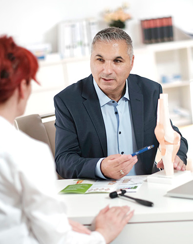 Symptome können z.B. der Anlaufschmerz im betroffenen Gelenk sein, Schmerzen bei Belastungen, beim Treppensteigen oder längerem Gehen sowie ein hörbares oder spürbares Knacken der Gelenke.